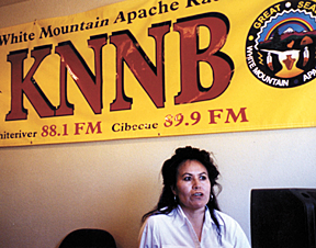 While local people appreciate KNNB, they don’t always agree about what it puts on the air. Music is what many listeners want to hear, according to Aday. “People say there’s too much talk, talk, talk.” Riley, on the other hand, thinks there is not enough talk, at least in Apache. He and some other White Mountain Apache, especially tribal elders, see KNNB as a tool to help save the language and preserve Apache culture. Station managers on many reservations will tell you, however, that while promoting the native language plays an important role for the public radio outlet, use of the native language on air generates its own set of problems since many under-40 listeners are not fluent in it or may not speak it at all. Managers also often find it difficult to locate on-air talent fluent in the language.