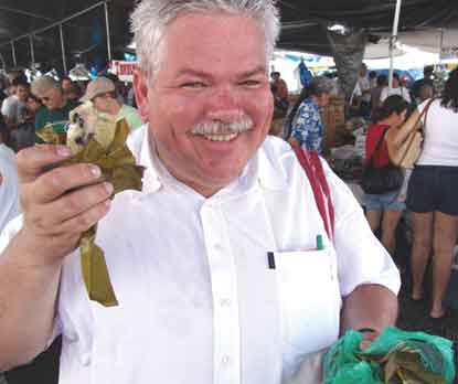 While shooting in Hilo, Hawaii, for August’s PBS doc on food markets, Sebak tastes sticky-rick-and-bean pudding in banana leaves. “We always find a food story,” he promises. (Photo: Bob Lubomski, WQED)