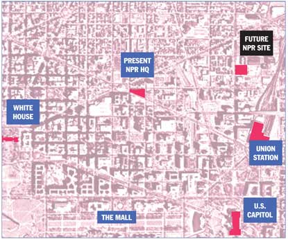 NPR has moved east and north with the march of office development in the city. Its present home, on the margin of a decaying neighborhood in 1994, is now surrounded by new apartments and adjacent to a vast new convention center.