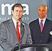 Stern, then NPR’s chief exec, announces the land deal. At right: D.C. Mayor Adrian Fenty. (Photo: NoMa BID.)