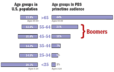 In contrast, 60 percent of PBS’s audience is over 60, Diaz says, though it has many Boomer viewers.