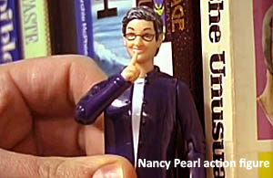 Nancy Pearl, a regular commentator on NPR’s Morning Edition, Seattle’s KUOW and Tulsa’s KWGS, was named Librarian of the Year by Library Journal, the magazine announces in its issue next week. The University of Washington professor developed the widely imitated One City, One Book citywide book discussions in 1998 before she retired from the Seattle Public Library. A former librarian in Detroit and Tulsa, Pearl remains already one of very few library science personalities to have an action figure made in her image (with shushing action, $8.95 for standard or $12.95 for deluxe). Though Pearl still loves printed books, she admits to occasional reading on her iPad. She pointed out one advantage to Library Journal: “Romance readers I watch love the technology. They can download all the romances, and nobody will see the covers.”