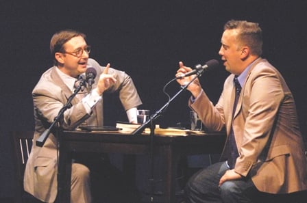 Moe, right, hosts his friend, writer John Hodgman (yes, it’s the PC guy from Mac ads) in an MPR tryout of Wits last year. (Photo: Tom Campbell, MPR.)