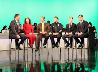 KCET in Los Angeles raised $70,495 during its May 24 live televised benefit for Japan, 100 percent of which will go to relief efforts in the regions most affected by the earthquake and tsunami disasters, the station says. L.A. Mayor Antonio Villaraigosa made a special appearance during the three-hour primetime show, which will be rebroadcast locally from 3 to 6 p.m. Saturday. KCET is working with U.S.-Japan Council to disburse funds to NGOs in Japan. Above, from left, KTLA’s Frank Buckley and actress Lily Mariye with Villaraigosa, L.A. Deputy Police Chief Terry Hara, actor George Takei, and U.S.-Japan Council’s Bryan Takeda during the telethon. (Image: KCET)