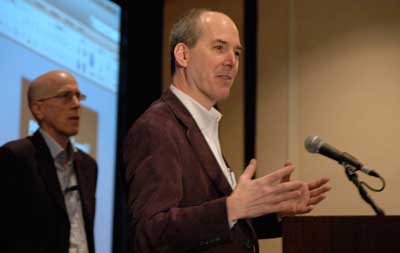 Kinsey Wilson discusses NPR web services at Integrated Media Association (IMA) Conference in Austin, Texas, in March. At left: his PBS counterpart, Jason Seiken.