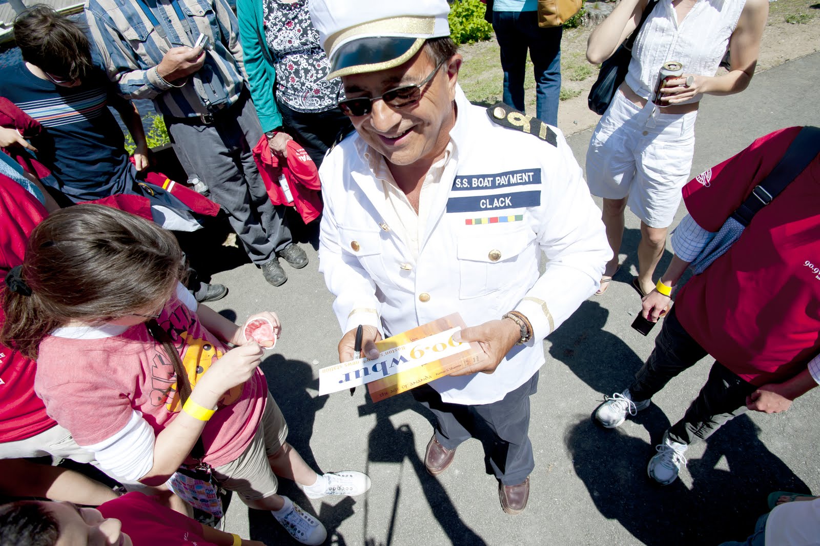 Tom and Ray Magliozzi of Car Talk got out of the garage and headed for the Charles River for WBUR’s annual Spring Festival at the Community Rowing Inc. boathouse in Boston on June 5. The two, known on the air as Click and Clack the Tappet Brothers, turned up as boat captains; above, Capt. (Ray) Clack signs autographs. Some 1,000 fans turned out to meet the Car Talk guys and other WBUR celebs such as On Point’s Tom Ashbrook. The boathouse set a record for the day, teaching more than 500 persons how to row. (Image: WBUR)