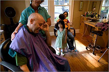 When chemo made his hair start to fall out, Kaplan told his kids he was getting a “super-crazy summer haircut” and brought them along. The family fun was interrupted momentarily when Kaplan was overcome with emotion. (Image by John Kaplan.)