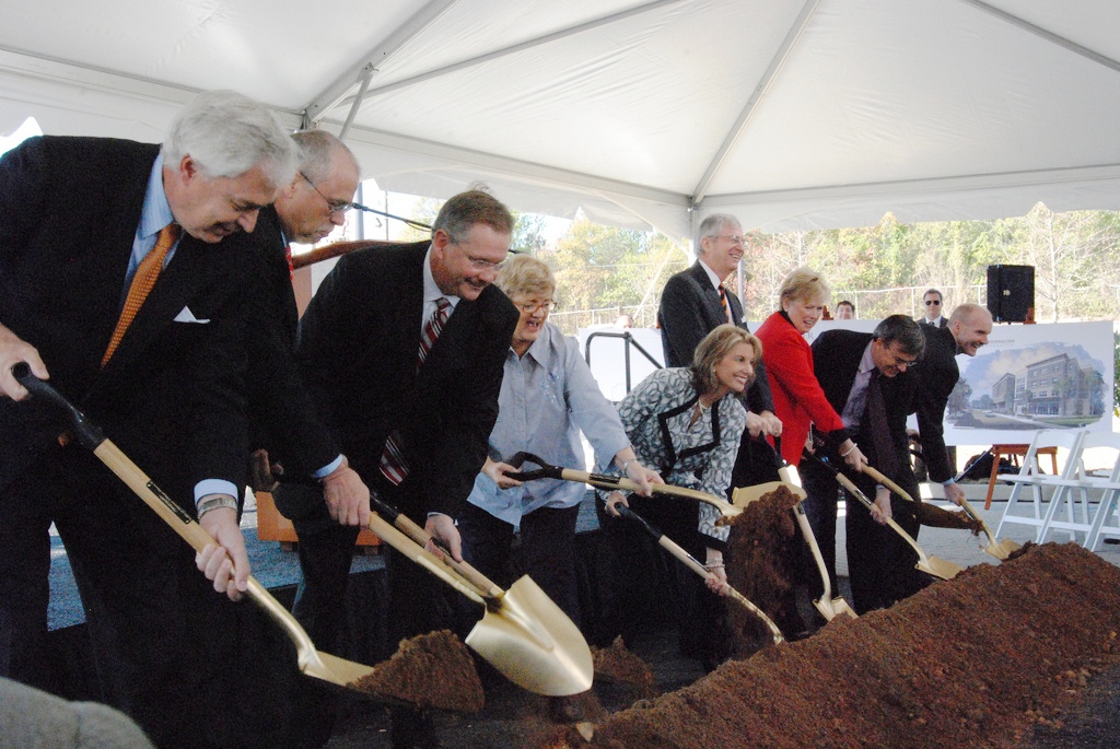 The center will reside in Mercer Village, a new mixed-use development on campus where ground was broken today. The first floor of the development, nearly 12,000 square feet, will house faculty offices, classrooms and labs for Mercer’s Journalism and Media Studies Department; offices for The Telegraph’s editors; and an open newsroom that will be shared by the newspaper, the journalism department and GPB Media. The pubcaster’s Macon radio and television studios are nearby.
