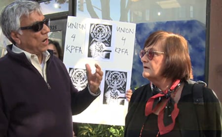 Arlene Engelhardt, right, at a 2010 protest of program changes at KPFA (Photo: kpfaworker9415 via YouTube).