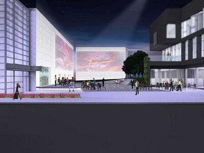 Designed to be a “powerful expression” of the future of public media, the Public Media Commons is a pedestrian-friendly and interactive space that will give visitors the opportunity to view content on wall-size screens as well as curating content via interactive and touch displays. The community space will also have concert space and public art including a digital “tree.”