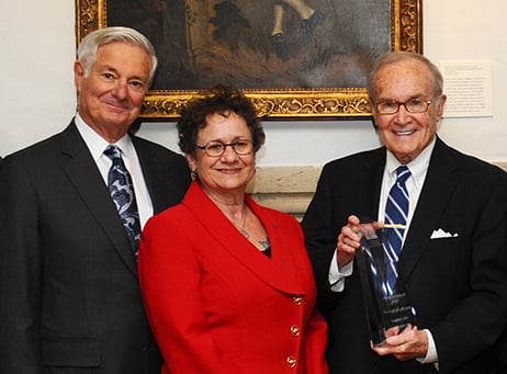 Newton Minow, at right with CPB Director Bruce Ramer and Chair Patricia Cahill, spurred the development of public broadcasting in the 1960s by calling for public interest standards and educational values in the emerging medium of television. CPB presented it Lifetime Achievement Award to the former FCC chairman.