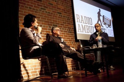 Daniel Alarcón, Francisco Goldman and Junot Díaz speak at a benefit event for Radio Ambulante. (Photo: Radio Ambulante)