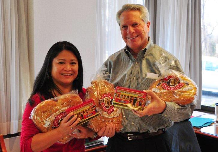 Faith Wachter, left, MPT director of community engagement, and MPT President Larry Unger display sourdough bread and chocolates received from KQED in San Francisco as a result of the Super Bowl wager. (Photo: Maryland Public Television)