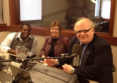 WDKX’s Tariq Spence, left, and WXXI’s Bob Smith teamed up to interview Kate Bennett, president of the Rochester Museum and Science Center, about a traveling exhibit on race that was hosted by the museum. (Photo: Jeanne Fisher, WXXI)