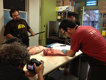 Barbecue master Aaron Franklin demonstrates proper brisket-cutting technique in BBQ with Franklin, the web-exclusive series that Austin’s KLRU produced with crowdfunding and support from PBS Digital Studios. (Photo: KLRU)