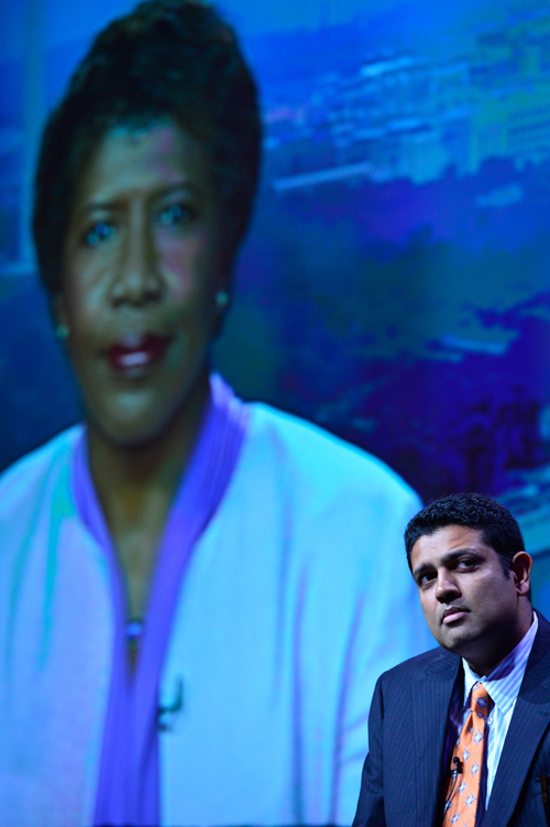 During the TCA Press Tour, Hari Sreenivasan, anchor for PBS NewsHour Weekend, faces TV critics while Gwen Ifill, co-anchor of the flagship weekday program, appears via satellite. (Photo: Rahoul Ghose/PBS)