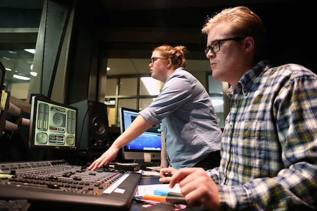 Director Haley Howle, left, and Technical Director Casey Cheek produce an episode of Texas Standard.
