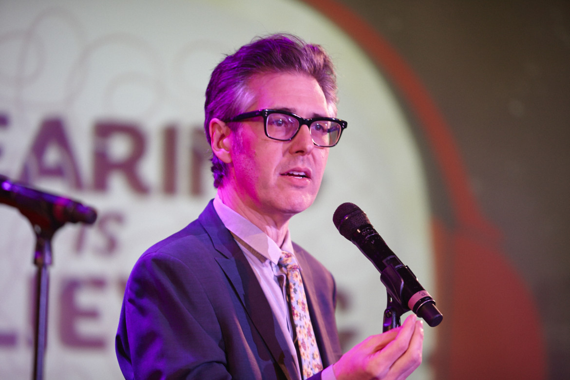 Glass speaks to advertisers at a podcast upfront event in New York City April 29. (Photo: Mattew Septimus/NPR)