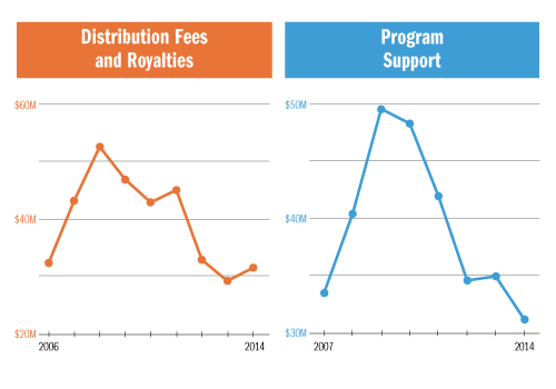 Sesame Workshop divides annual revenue from domestic and international subsidiaries into three main categories: program support, licensing, and distribution fees and royalties. Licensing includes all merchandise that uses the nonprofit company’s intellectual properties, while program support includes individual contributions and government grants. Revenue from DVD sales is categorized as distribution fees and royalties. “Revenue by Source” chart depicts fiscal year 2014 figures. (Analysis by Ben Mook. Graphs: Kelly Martin Design)