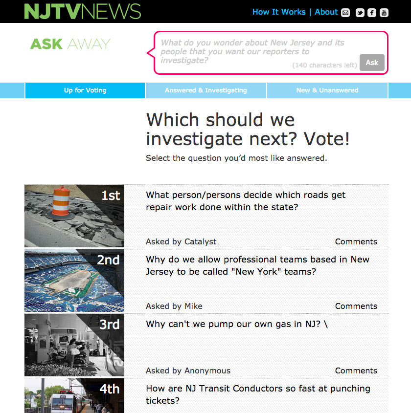 “This is a great way to bring the public further into public television,” NJTV General Manager John Servidio said in an announcement of the launch. “We are dedicated to statewide news coverage, and the NJTV News Ask Away feature will help us further extend our news reach with items of local interest.”