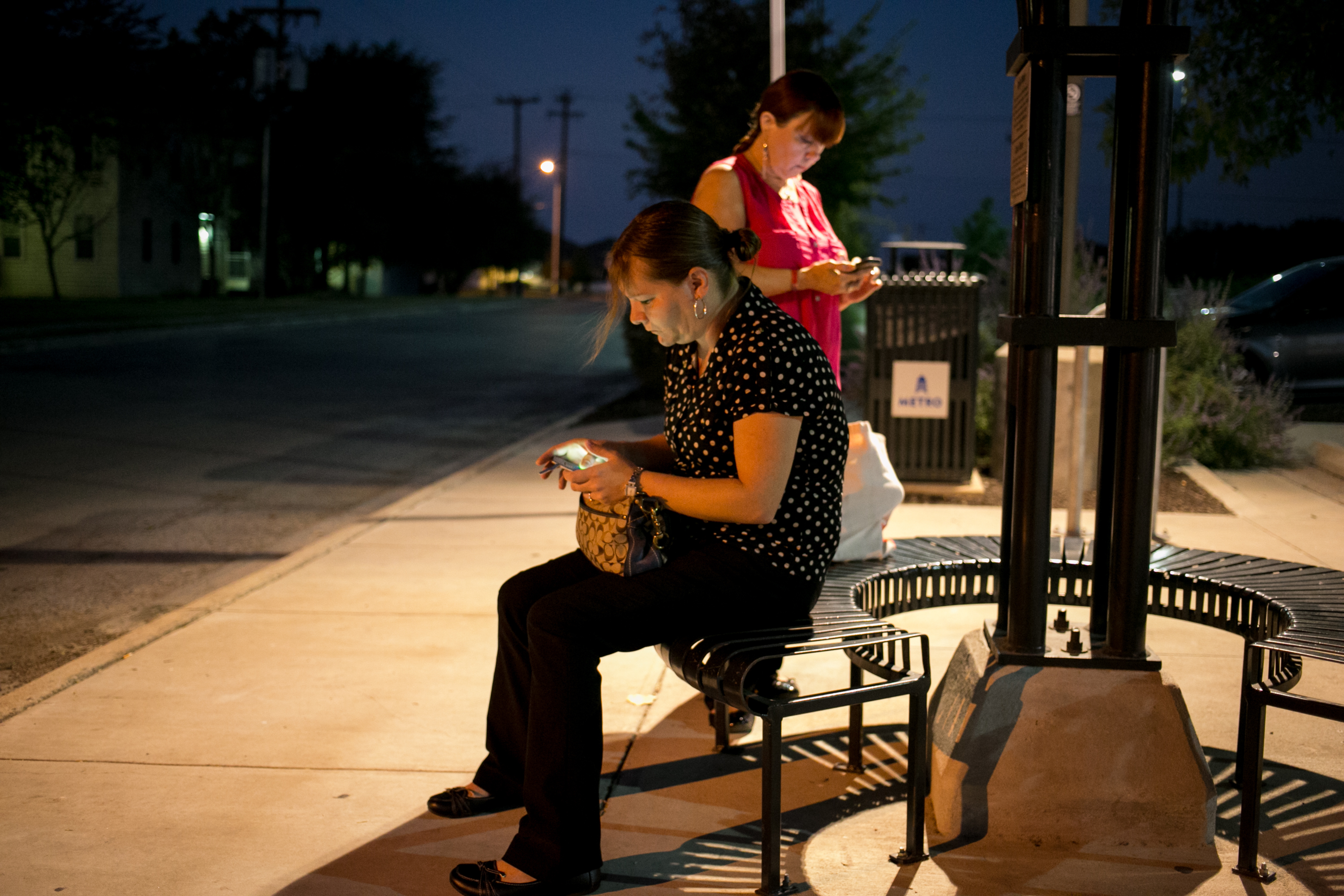 Women wait for an early-morning bus to Austin at the Park & Ride in suburban Manor, Texas. KLRU-TV and KUT-FM looked at transportation challenges in their “Austin’s Eastern Frontier” series on rapid growth in the metro area. (Photo: Ilana Panich-Linsman)