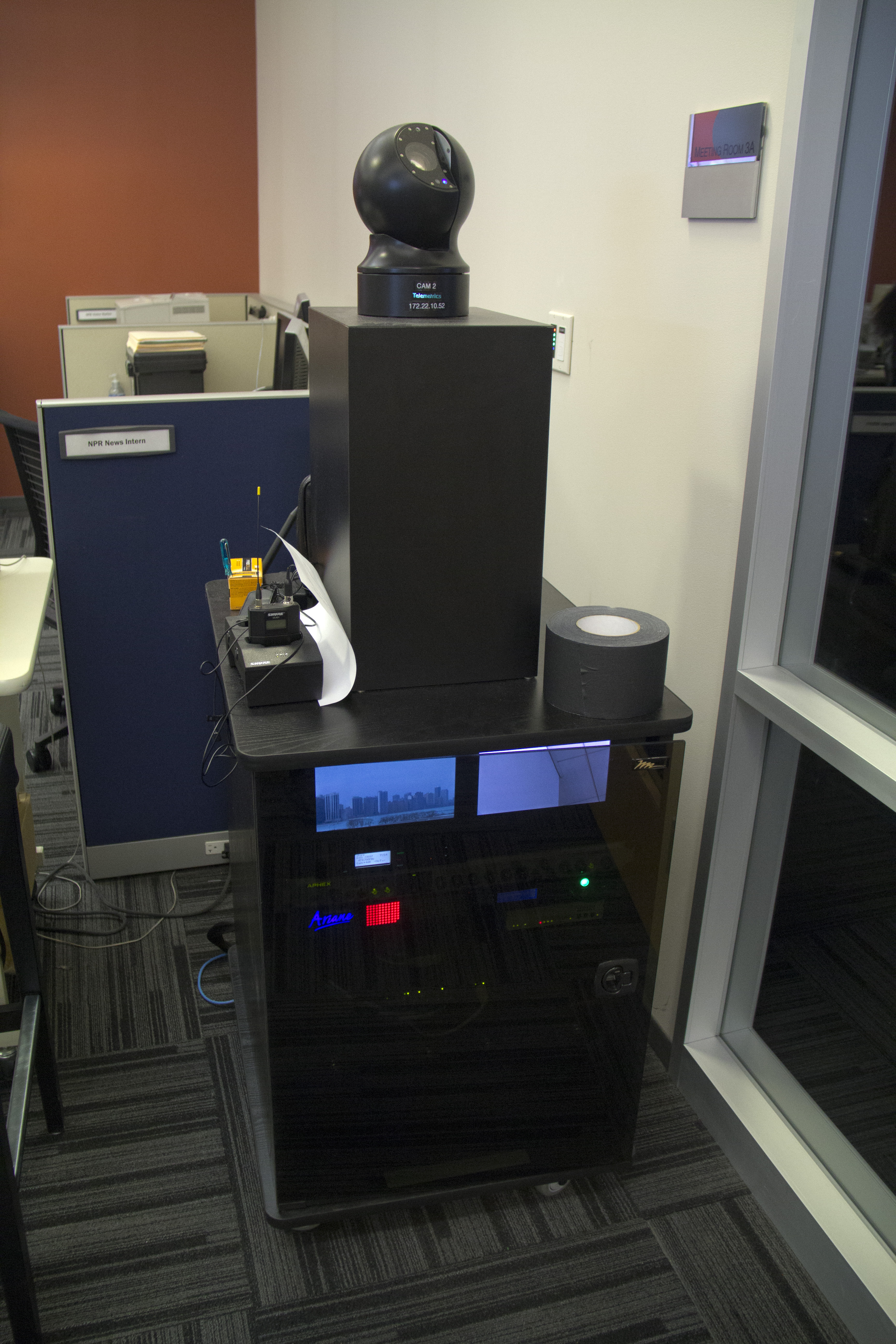 The robotic camera in WBEZ’s newsroom allows the radio station’s reporters to appear on Chicago Tonight, the daily public affairs program on WTTW-TV. It’s logical the two stations collaborate, said WTTW President Dan Schmidt, “when our missions overlap so significantly.” (Photo: Andrew Gill, WBEZ)