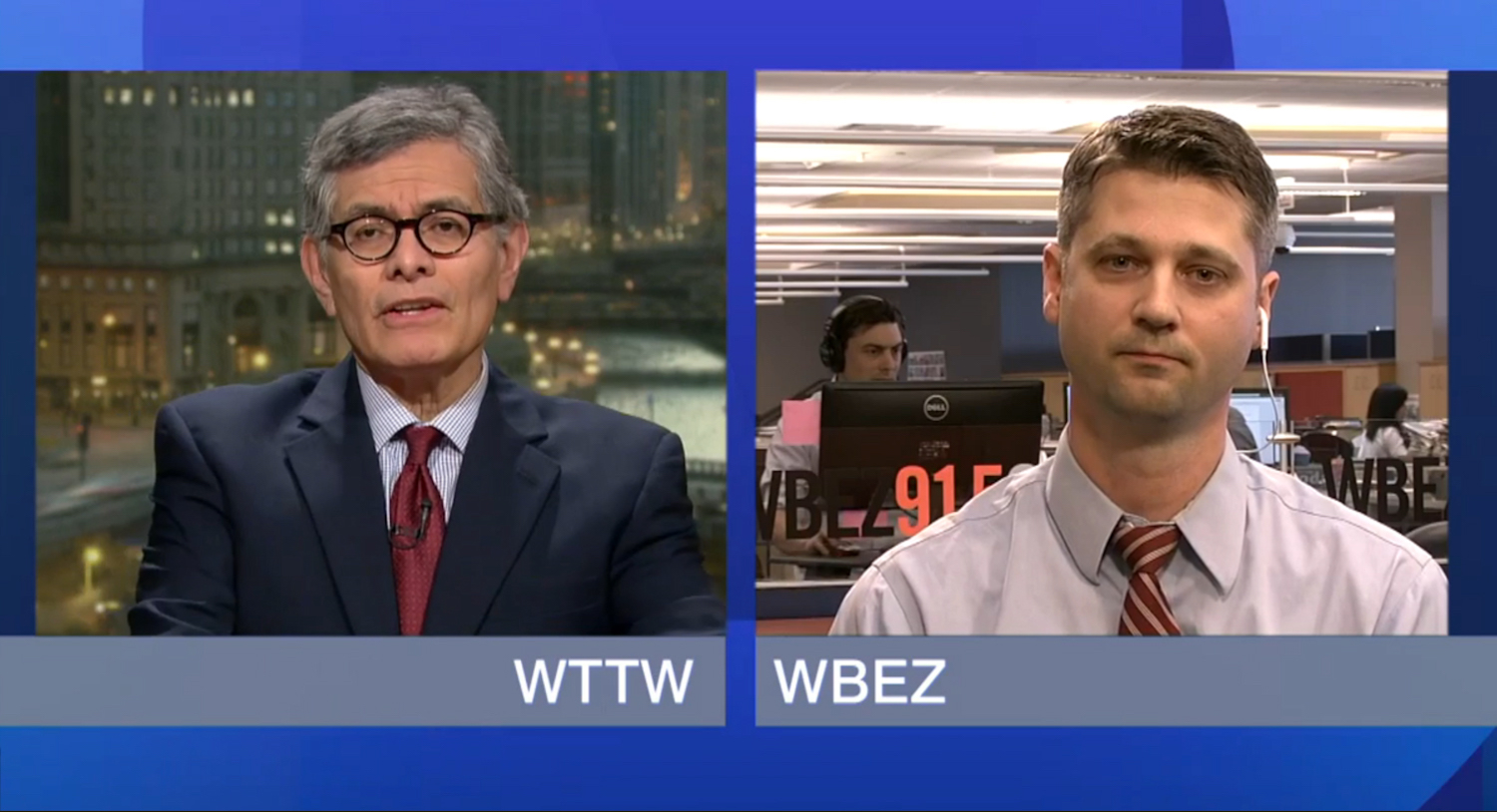 The stations split the $50,000 cost of a robotic camera that connects the WBEZ newsroom at Navy Pier to WTTW on the city’s north side. That equipment upgrade, announced March 28, allows radio journalists to report live on Chicago Tonight during its 7 p.m. broadcast. A new high-speed fiber connection also lets WTTW hosts contribute to WBEZ broadcasts.