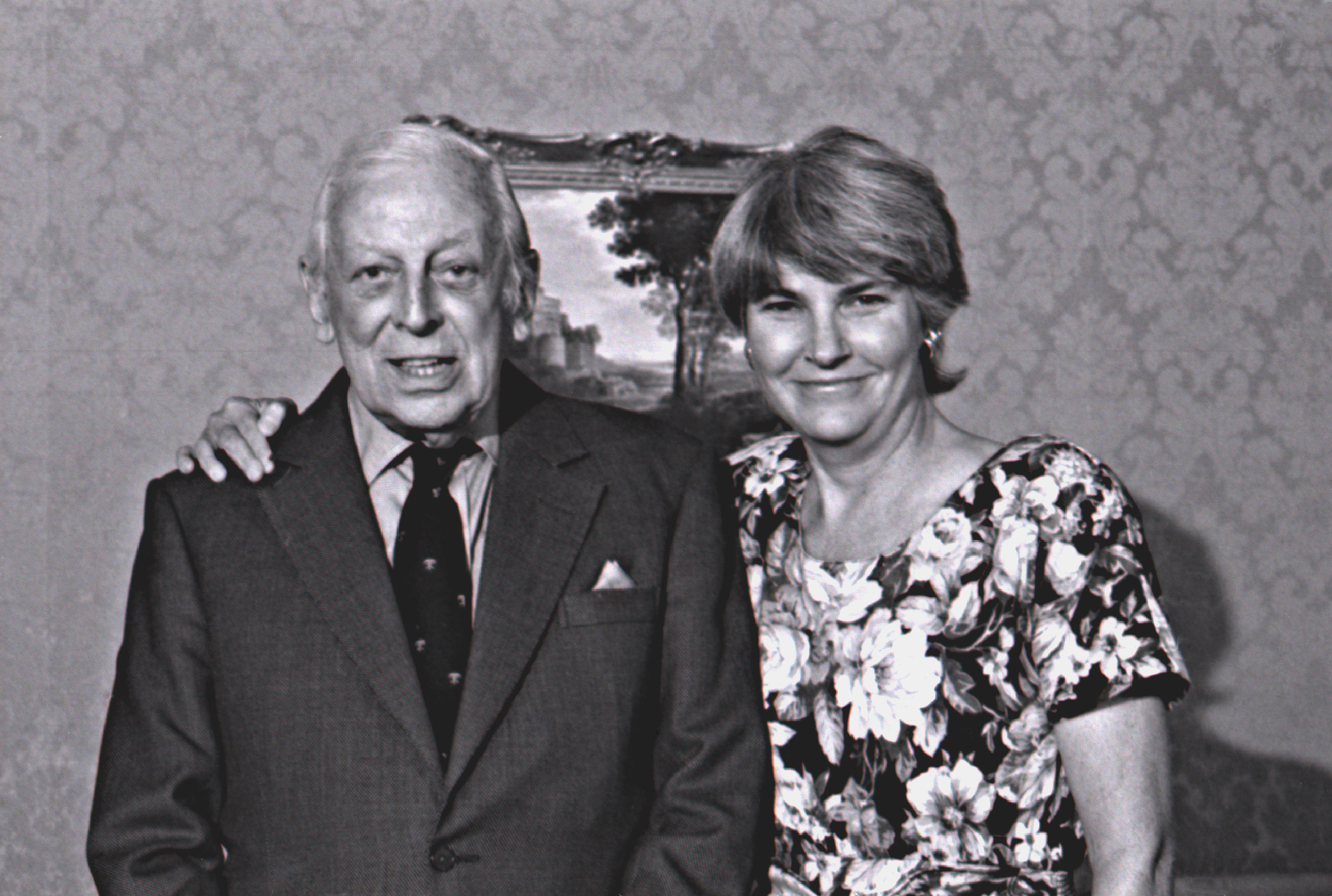 Longtime Masterpiece Theatre host Alistair Cooke pauses for a photo with Eaton at the 1992 PBS Annual Meeting in San Francisco.
