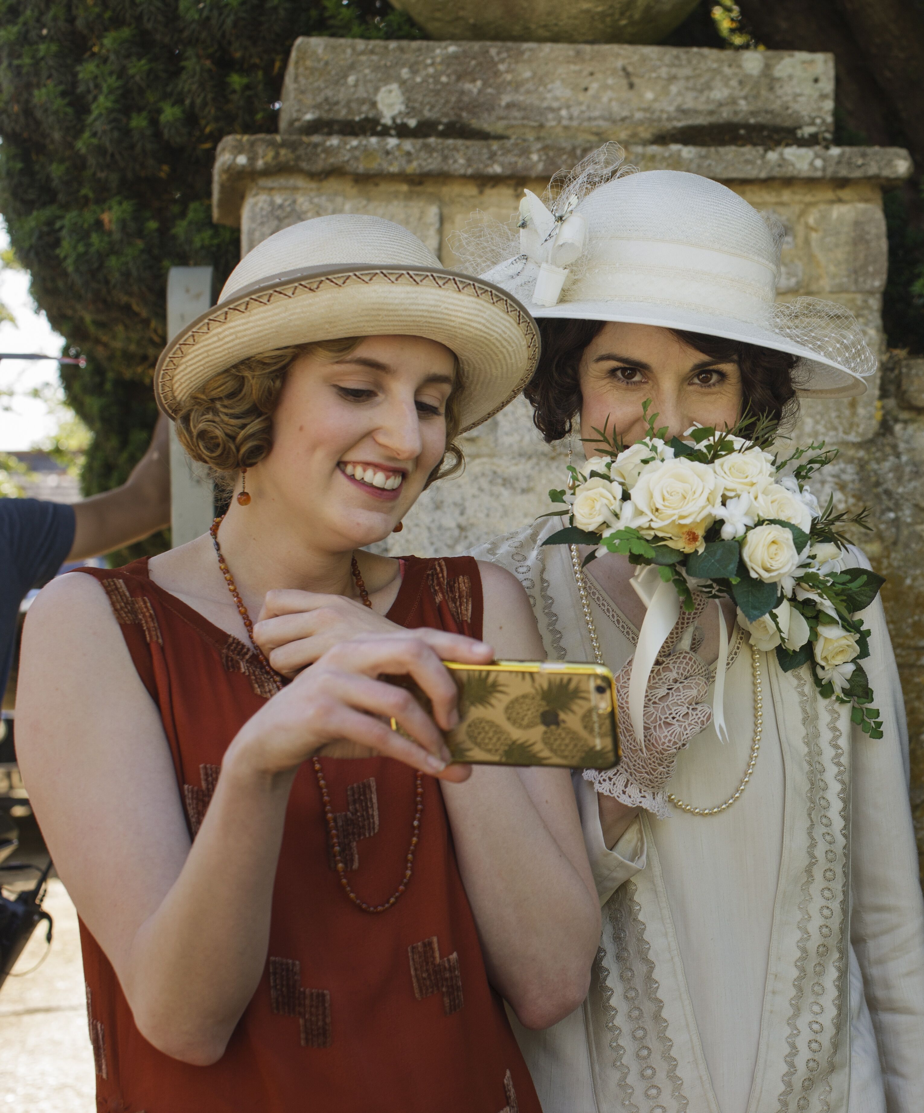 Actors Laura Carmichael, left, and Michelle Dockery snap a selfie on the Downton set. (Photo: Carnival Film and TV)