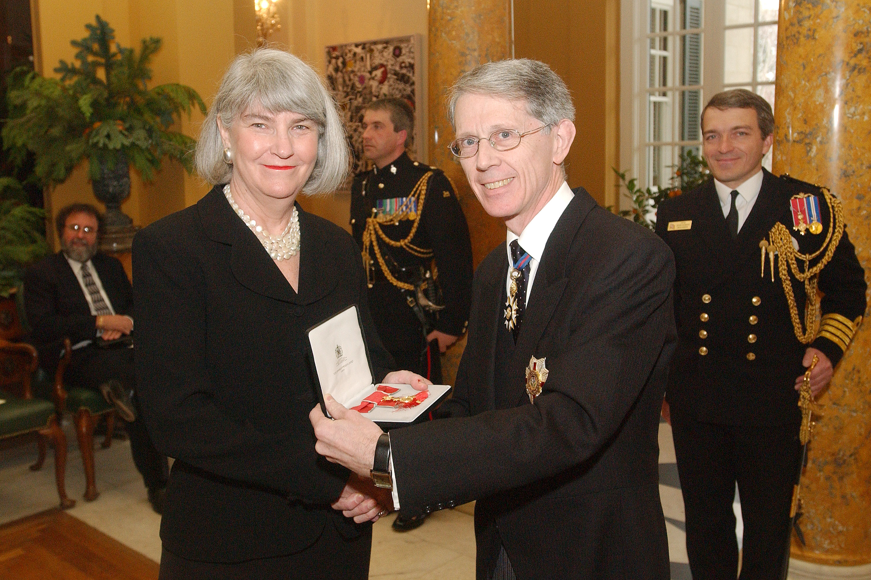 British Ambassador David Manning presents an honorary Officer, Order of the British Empire, title to Eaton in 2003 in Washington, D.C. “One of the joys of my job is the opportunity to present England’s rich culture and history to American audiences through drama,” Eaton said at the time. “It’s gratifying to be honored for work which I love.” (Photo: WGBH)