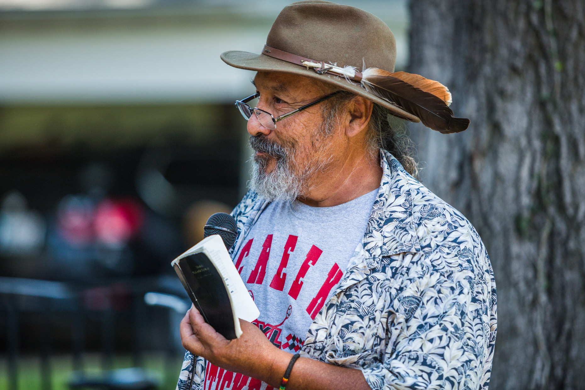 Creek Indian JD Colbert speaks to the crowd during a bike ride tracing historic Native spots in Tulsa, Okla., part of Localore’s Finding America project at KOSU. (Photo: Shane Brown)