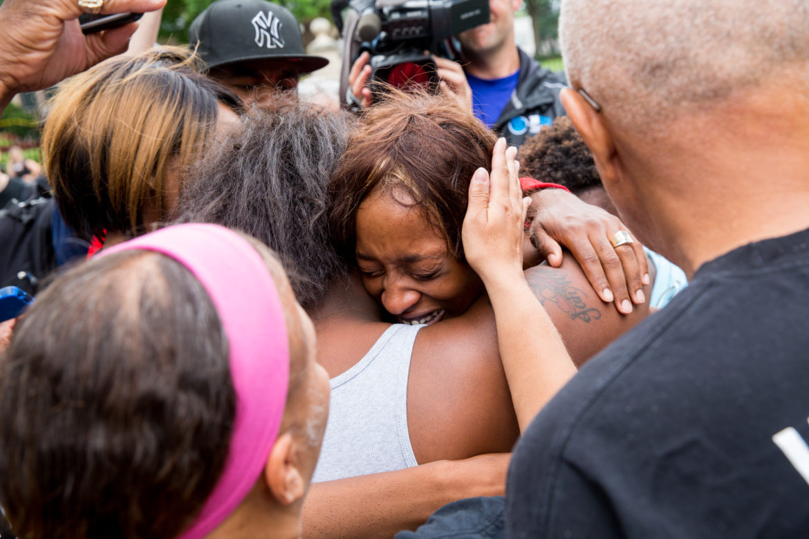 Friends and supporters console Diamond Reynolds after she arrives at the governor’s mansion in St. Paul, Minn., the morning of July 7. The day before, her boyfriend Philando Castile was shot and killed by a police officer. (Photo: Evan Frost, MPR News)