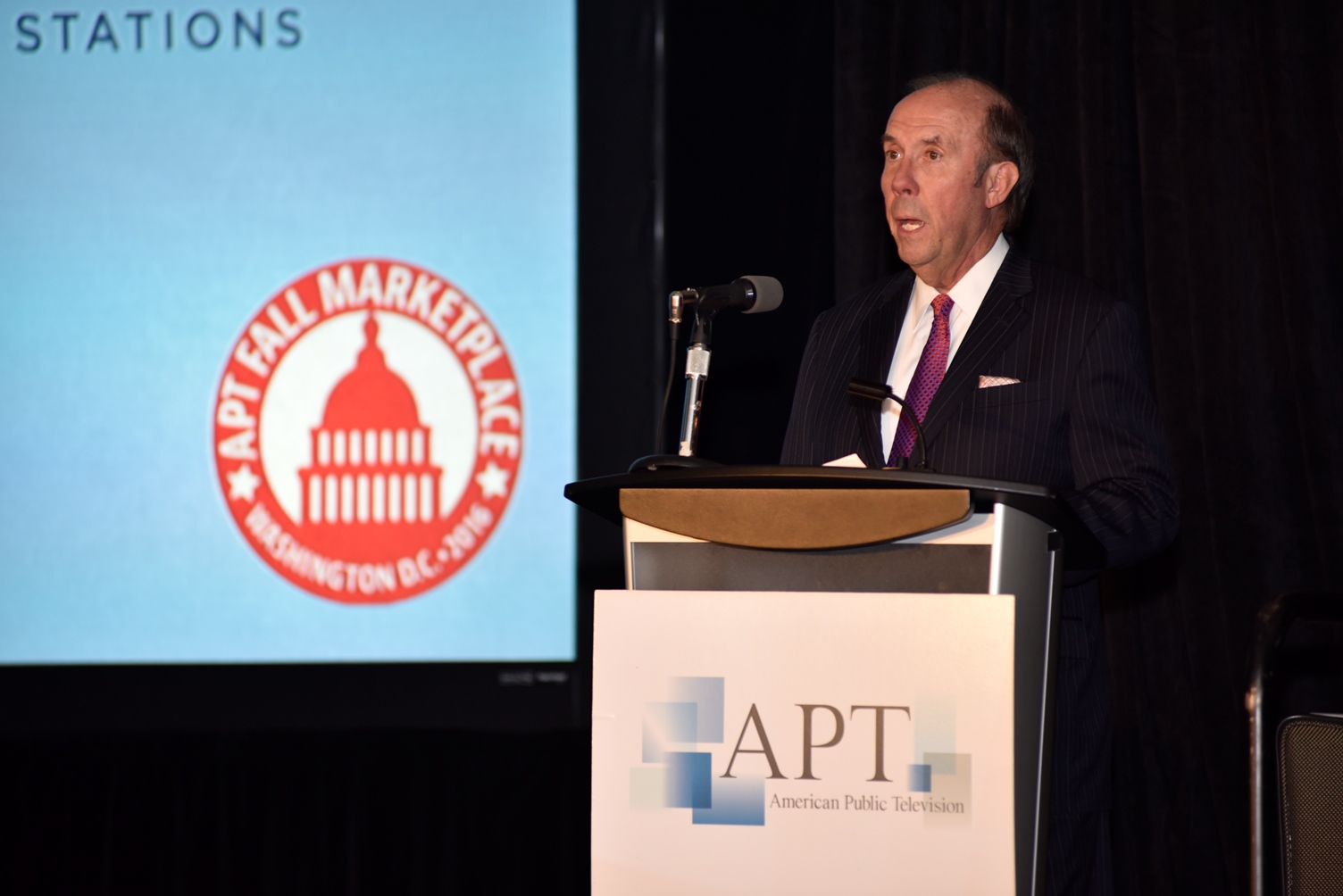 Patrick Butler, president of America’s Public Television Stations, addresses the crowd at at American Public Television’s annual Fall Marketplace Friday. (Photo: Ed Shenkman/ APT)