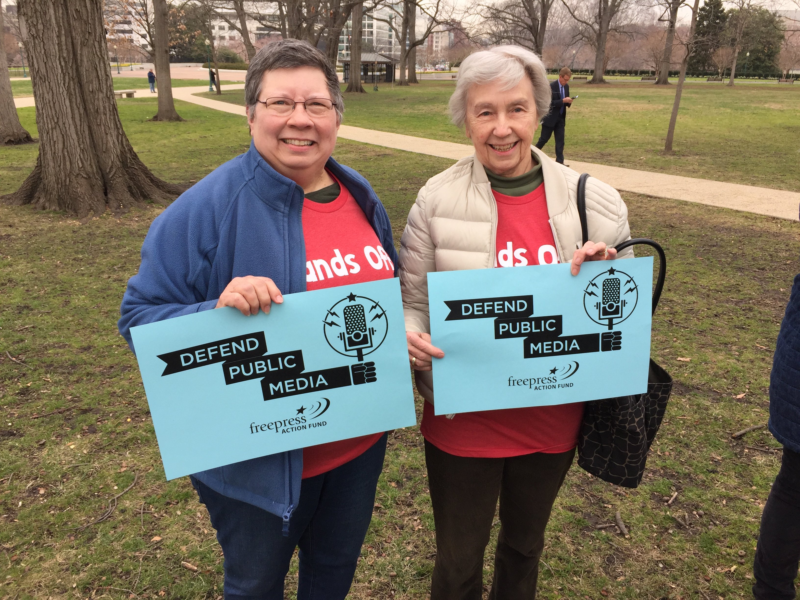 Barbara Kaetzel-Row of Bedford, Pa., and Betsy Dolard of Annapolis, Md., hoisted sky-blue “DEFEND PUBLIC MEDIA” signs. The two met for the first time that morning on a train. Kaetzel-Row was traveling from Pennsylvania to the Library of Congress to do some genealogical research “when Betsy talked me into doing this instead,” she said. “This is important.”