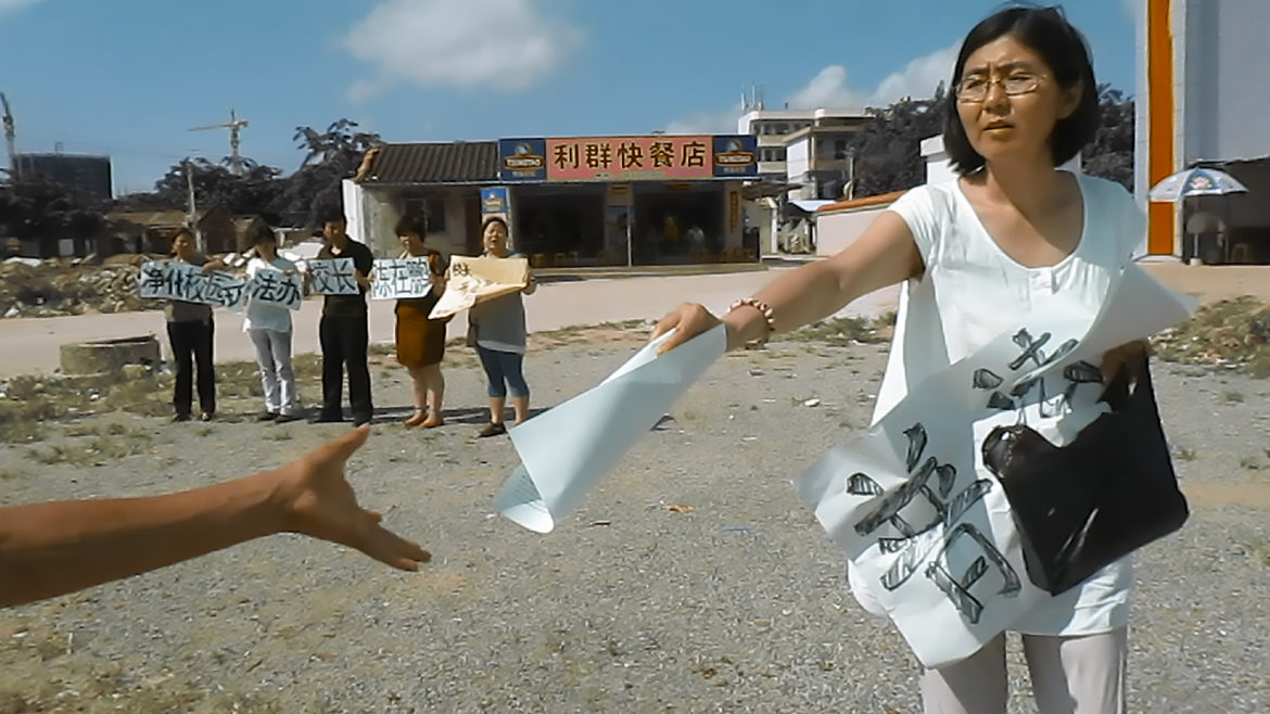 Chinese human-rights lawyer Wang Yu hands out copies of the UN Convention on the Rights of the Child during a May 2013 protest.