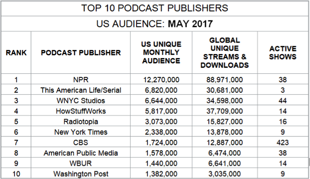 Those advantages pushed public radio companies to the top of podcast rankings at the dawn of the podcast era 10 years ago, and public radio continues to dominate the medium. Of 183 million downloads reported for Podtrac’s top-10 publishers in May 2017, 73 percent came from a “public media cohort” of networks, stations and closely aligned producers. NPR itself supplied more than a third of the total downloads.