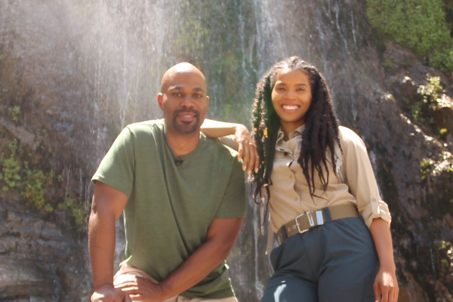 Timothy Jones and Iris Hill, co-hosts of KVCR’s new outdoor series “Hidden Hikes,” pause during a shoot at Bonita Falls in Lytle Creek, Calif.