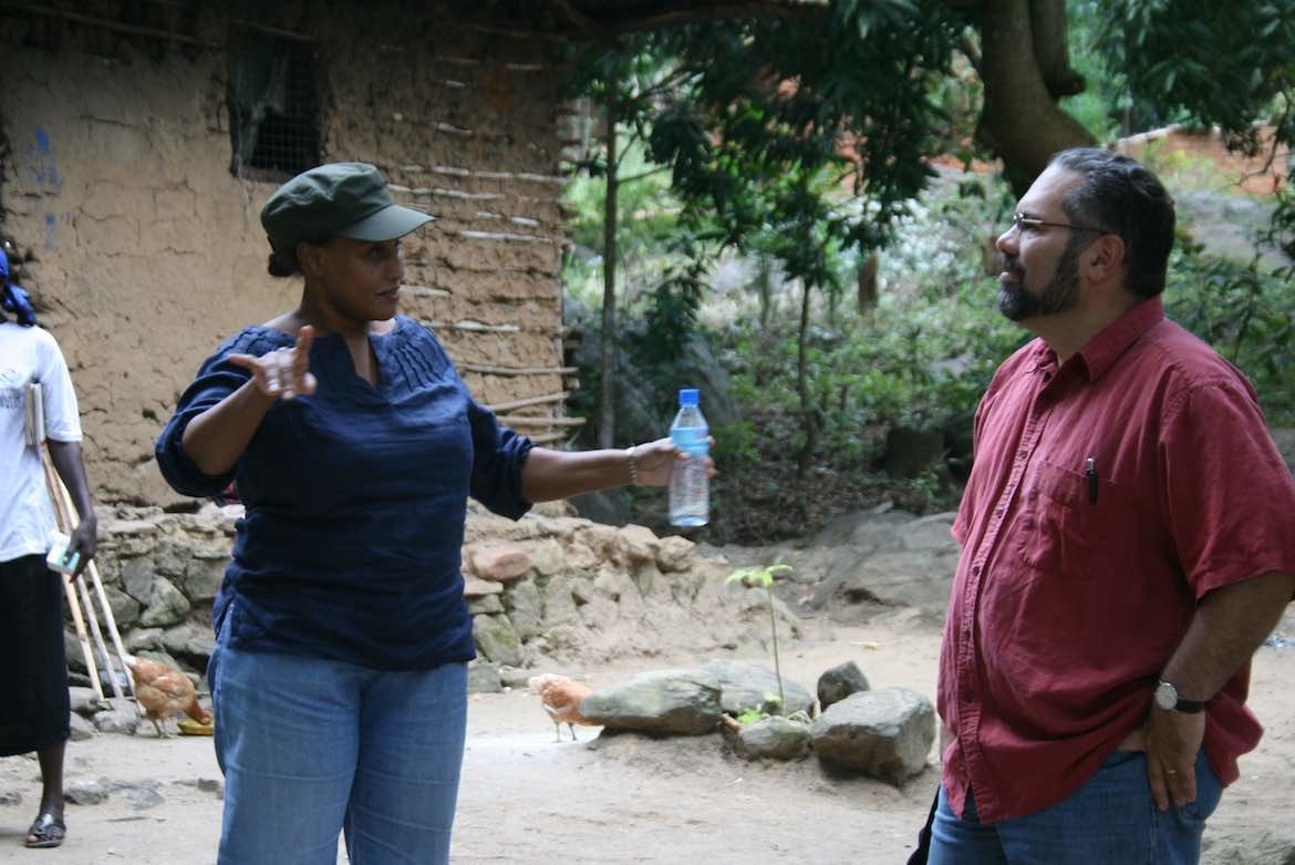 Suarez, right, talks with a local producer during a 2009 "NewsHour" field assignment in Tanzania.