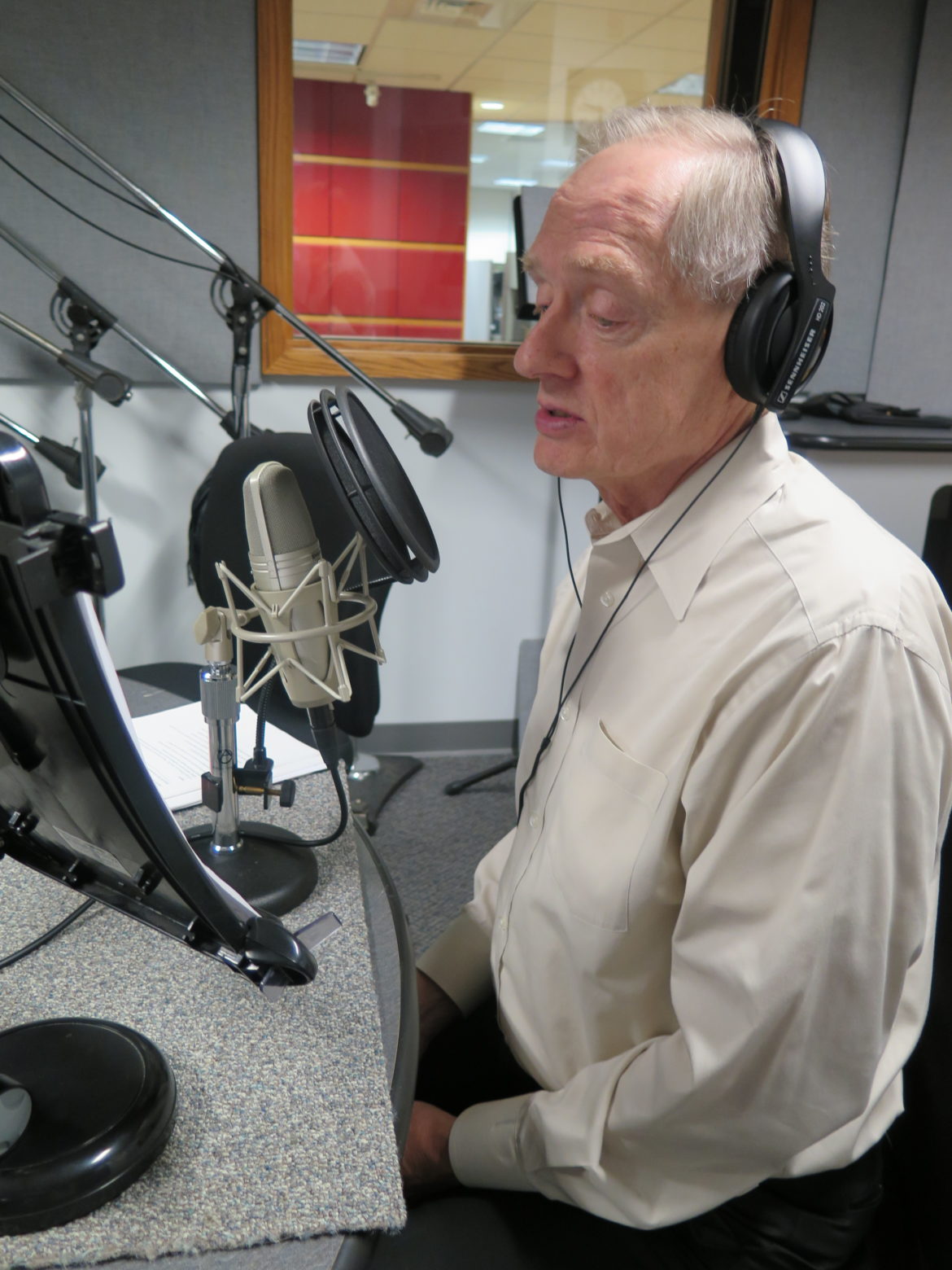 Schuster records an episode of Stories for the Ages in a WOSU studio.