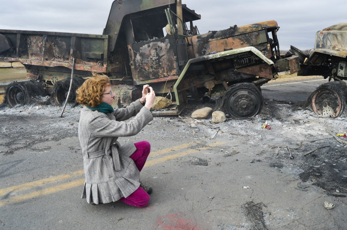 Inside Energy reporter Amy Sisk takes a photo while reporting on the Dakota Access pipeline protests in 2016.