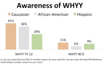 The survey found that people of color lacked basic awareness of the broadcaster. Only 5 percent of African Americans said they were aware of WHYY 90.9; 24 percent of Hispanics were aware of WHYY TV.