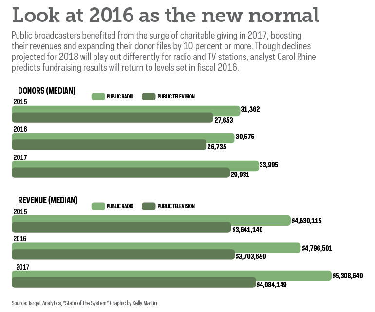 Public radio and public TV will experience the projected shift in 2018 fundraising differently, Rhine said. Some public radio stations may get a midterm election bump, if they haven’t already. But radio as a whole is more likely to see a return to pre-Trump bump levels because the threat to federal funding has receded, Rhine said.
