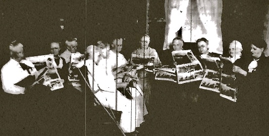 Residents of a Chicago nursing home listen to a “Radio Photologue” broadcast about Norway while viewing corresponding images in the newspaper. Chicago Daily News, March 15, 1925.