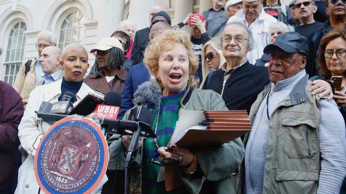 WBAI volunteer producer Mimi Rosenberg speaks Oct. 15 at a rally at New York's City Hall supporting the station. New York City Council Majority Leader Laurie A. Cumbo is to her left.