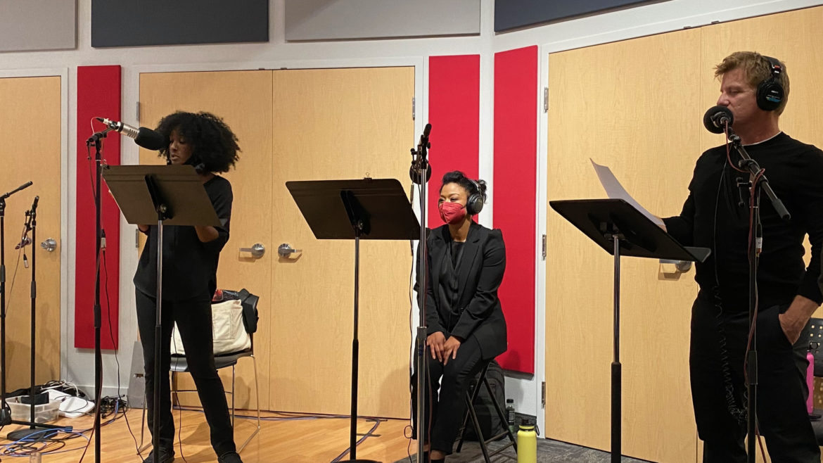 Adriane McLean, Sabrina Cofield and Joe Schoenmann perform "Beneath Area 51!" Oct. 26 in Nevada Public Radio's studios.