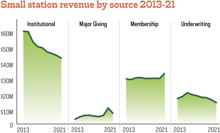 An ongoing decline in institutional support for small stations is one key driver of this trend. Direct and indirect assistance from universities, states and school districts is a large and critical component of small station revenue, and it’s been hit hard. Since 2013, institutional support for small stations has declined 28%. Meanwhile, institutional support for large stations grew by 12%.