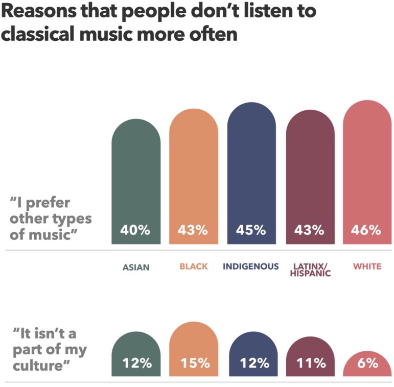 Furthermore, few people of any racial or ethnic background feel a cultural barrier to their enjoyment of classical music. For most people of color, the barrier isn’t that they don’t see classical music as part of their culture. What keeps them from listening to classical music more frequently is that they prefer other genres of music, or they listen to classical music only when it fits a specific mood or activity.