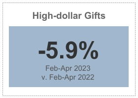 The High Dollar Index, down 5.9%, continues to reflect station challenges in attracting $500+ gifts in a market that grows increasingly competitive in its focus on major donors. These challenges are greatest among large stations, down 7.6% compared to medium- and small-sized stations, down 4.9% and 2.3%. Interestingly, the High Dollar Index for TV and Joint stations, declining 7.4%, is down twice as much as radio stations, where a decline of 3.7% is reported. The need for focused and creative marketing strategy and investment aimed at major donors cannot be understated and will likely have considerable impact as stations edge closer to completing the fiscal year.