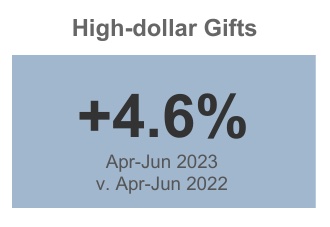 The High Dollar Index, up 4.6%, has returned to positive territory for two consecutive periods after four periods of decline and could be part of the reason behind the return to positive results in the broader Membership Revenue Index. The current results reflect positive increases in high-dollar gifts for both TV/Joint, up 5.3%, and Radio, up 3%. The ability of stations to attract donations of $500 or more varies significantly depending on the size of the station. For the April–June period, small stations show an increase of 13.3% in such donations, while medium stations report a decline of 1.3%. Meanwhile, large stations saw a 5.3% increase in donations of $500 or more.