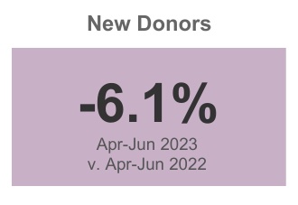After three consecutive periods of modest growth, the New Donor Index has decreased, down 6.1% for the three-month period ending in June. The relative volatility in donor acquisition is apparent in the index results. Radio stations, up over 16%, are reporting strong new donor acquisition, but much of this can be attributed to the comparison period (April–June 2022), when radio stations were struggling mightily in their efforts to attract new donors. Compare this to TV/Joint stations, down 8.1%, and you begin to see how varied results have been as all stations attempt to attract new donors. We will continue to monitor the volatility in new donor acquisition as many stations begin a new fiscal year and refocus efforts on investments in acquisition.